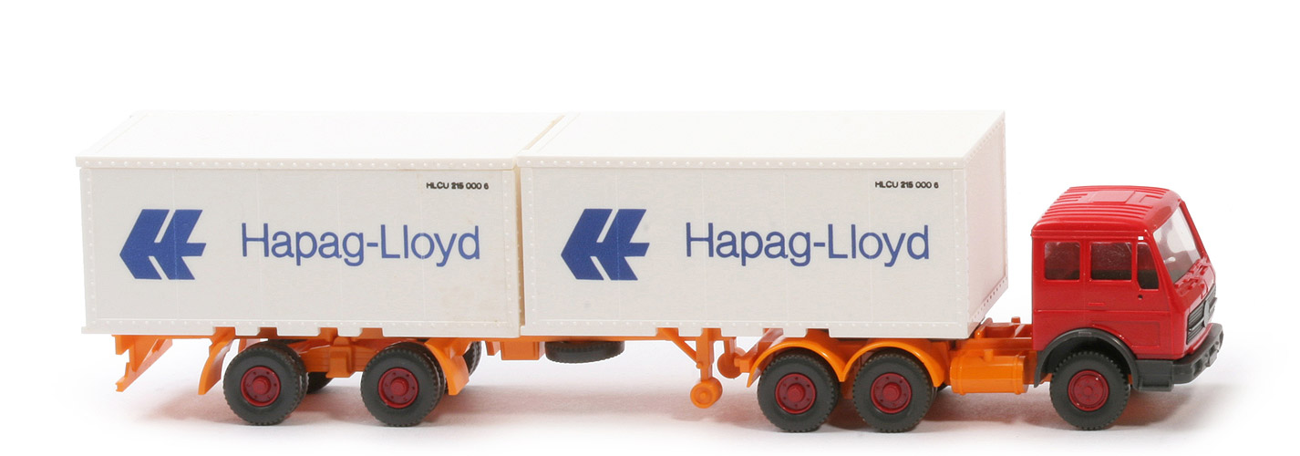 | Zugmaschine | Kabine | rot | eingesetzter Grill | schwarz, mit Streifen | Lüfter | flach | Heckfenster | offen | Spiegelaufnahmen | mit | Inneneinrichtung | ohne (!) | Stoßstange | basaltgrau | Chassis | orangegelb | Radlauf hinten | 2-teilig, orangegelb | Reserverad | ohne | Räder | Profil grob | Felgen | 6-Loch, hellbraunrot | | Container | Art | 2 x 20 ft neu | Farbe | weiß | Türen | alt | Beschriftung | Hapag-Lloyd (s. Foto) | Beschriftung Art | 36 mm, mit Nummer (Serie) | | Auflieger | Farbe | orangegelb (wie Serie) | Unterfahrschutz | mit | Königsbolzen | stark | Räder | Profil grob | Felgen | 6-Loch, hellbraunrot |