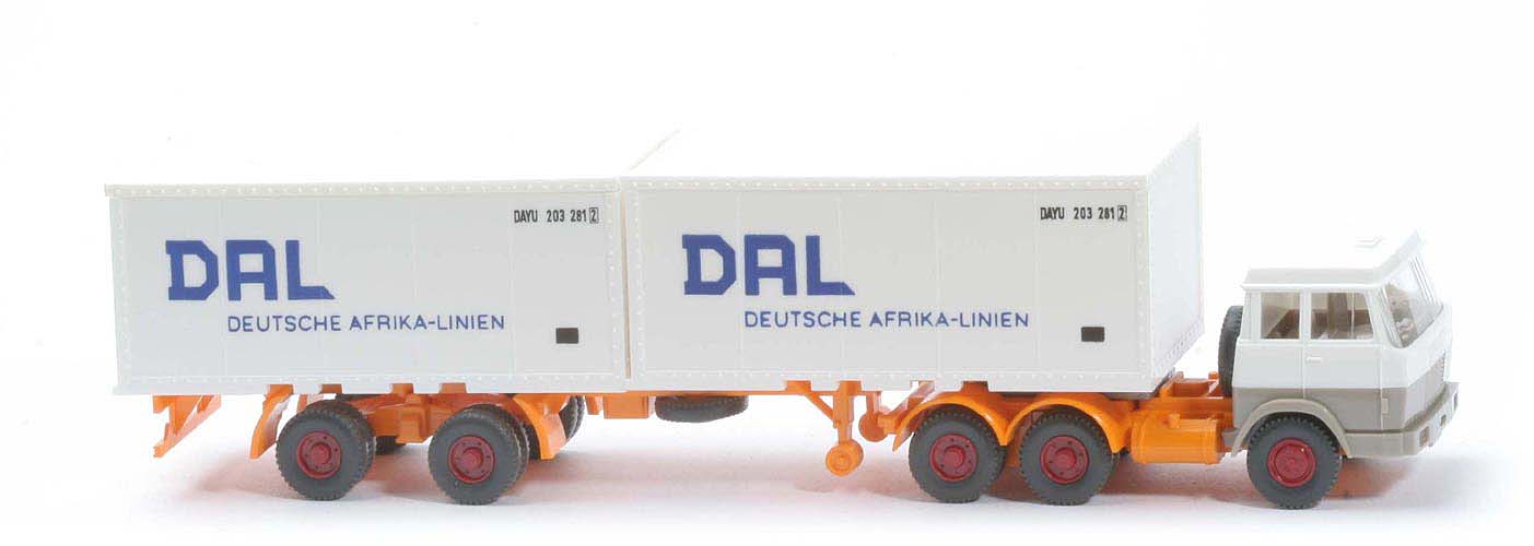 | Zugmaschine | Kabine oben | weiß | Kabine unten | graubeige | Verglasung | klar | Inneneinrichtung | ca. graubeige | Lenkrad | mit | Chassis | orangegelb | Radlauf hinten | orangegelb, 2-teilig | Sattelpfanne | für großen Königsbolzen | Reserverad | hinter Kabine | Räder | Profil grob | Felgen | hellbraunrot | | Container | Art | 2 x 20 ft neu | Farbe | weiß | Türen | alt | Beschriftung | DAL (s. Foto) | Beschriftung Art | Druck enzianblau/schwarz | | Auflieger | Farbe | orangegelb | Unterfahrschutz | mit | Königsbolzen | stark | Räder | Profil grob | Felgen | hellbraunrot |