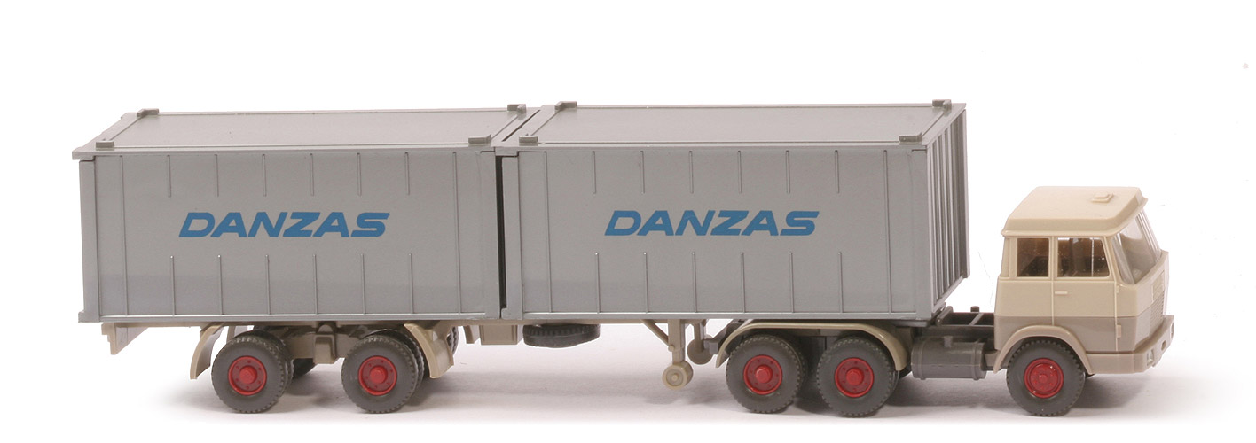 | Zugmaschine | Kabine oben | hellelfenbein | Kabine unten | graubeige | Verglasung | klar | Inneneinrichtung | 2 Sitze, Motorblock, ca. hellgelbgrau | Lenkrad | ohne | Chassis | basaltgrau | Radlauf hinten | olivgrau, 1-teilig | Sattelpfanne | für großen Königsbolzen | Reserverad | hinter Kabine | Räder | Profil grob | Felgen | hellbraunrot | | Container | Art | 2 x 20 ft gerippt | Farbe | silbern | Beschriftung | Danzas (s. Foto) | Beschriftung Art | 5 Felder, Druck | | Auflieger | Farbe | gelbgrau | Unterfahrschutz | ohne | Königsbolzen | stark | Räder | Profil grob | Felgen | hellbraunrot |