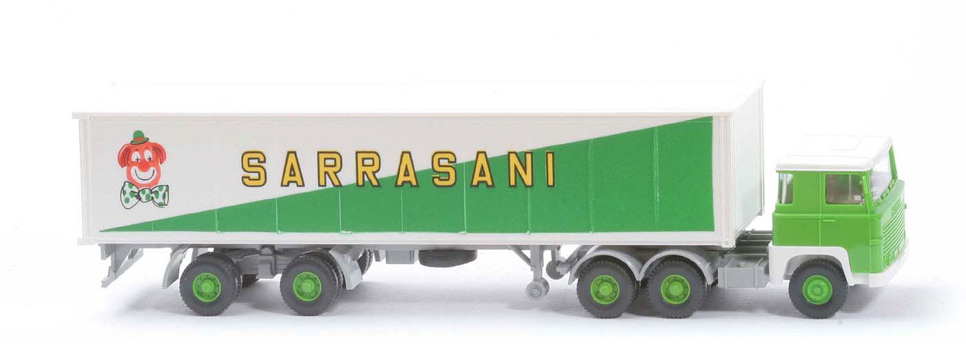 | Zugmaschine | Dach | weiß | Kabine oben | gelbgrün | Kabine unten | gelbgrün | Stoßstange | weiß | Scheinwerfer | 2, ungesilbert | Spiegel | mit | Scheibenwischer | mit | Lenkrad | mit | hinterer Radlauf | silbergrau | Sattelpfanne | für großen Königsbolzen | Reserverad | ohne | Chassis Farbe | silbergrau | Räder | 12mm, Profil grob | 8-Loch-Felgen | gelbgrün | | Container | Art | 40 ft Glattwand | Dach | weiß | Korpus | weiß | Türen | neu, weiß | Beschriftung | SARRASANI (s. Foto) | | Auflieger | Farbe | silbergrau | Unterfahrschutz | mit | Königsbolzen | stark | Räder | 12mm, Profil grob | 8-Loch-Felgen | gelbgrün |