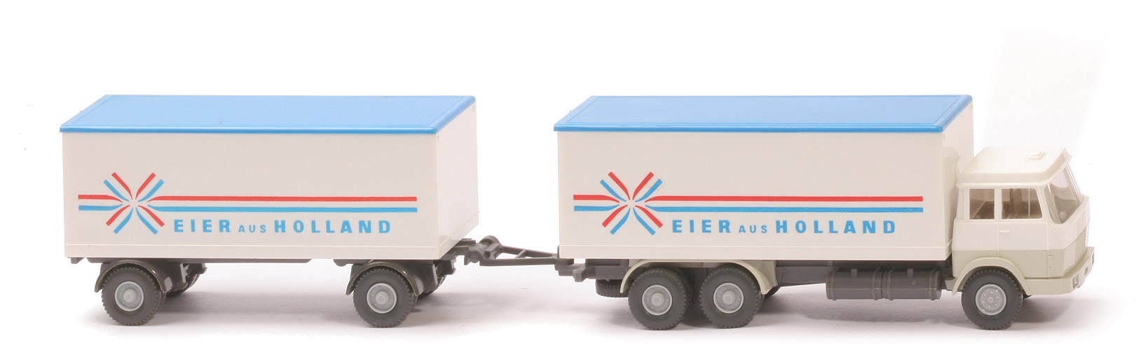 | Zugwagen | Kabine oben | weiß | Kabine unten | perlweiß | Verglasung | klar | Inneneinrichtung | 2 Sitze, Motorblock, ca. gelbgrau | Lenkrad | ohne | Scheinwerfer | unbemalt | Koffer Korpus | weiß | Koffer Dach | himmelblau | Koffer Türen | weiß | Druck | Eier aus Holland (s. Foto) | Chassis | basaltgrau | Radlauf hinten | perlweiß, einteilig | Räder | Profil grob | Felgen | silbergrau | | Hänger | Koffer Korpus | weiß | Koffer Dach | himmelblau | Koffer Türen | weiß | Chassis | basaltgrau | Radläufe | basaltgrau | Druck | Eier aus Holland (s. Foto) | Räder | Profil grob | Felgen | silbergrau |