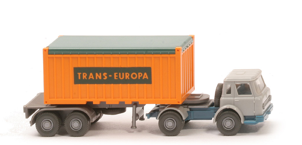 | Zugmaschine | Kabine | silbergrau | Lüfter | mit | Inneneinrichtung | azurblau | Verglasung | klar | Chassis | azurblau | Radlauf hinten | silbergrau | Sattelpfanne | für großen Königsbolzen | Reserverad | hinter Kabine | Räder | Profil grob | Radkappen | silbern | | Container | Art | Open Top | Farbe Korpus | orangegelb | Farbe Dach | patinagrün | Beschriftung | Trans-Europa (s. Foto) | Beschriftung Art | Negativ-Druck grün | | Auflieger | Farbe | basaltgrau | Variante | mit Markierung, mit Bohrungen neben KoBo | Reserverad | unter Auflieger, gesteckt | Bodenprägung | 52h | Doppelachsaggregat Farbe | basaltgrau | Doppelachsaggregat Typ | Klemmplatte WIKING u. GERMANY | Hydraulikstützen | silbern, gesteckt | Räder | Profil grob | Radkappen | silbern |