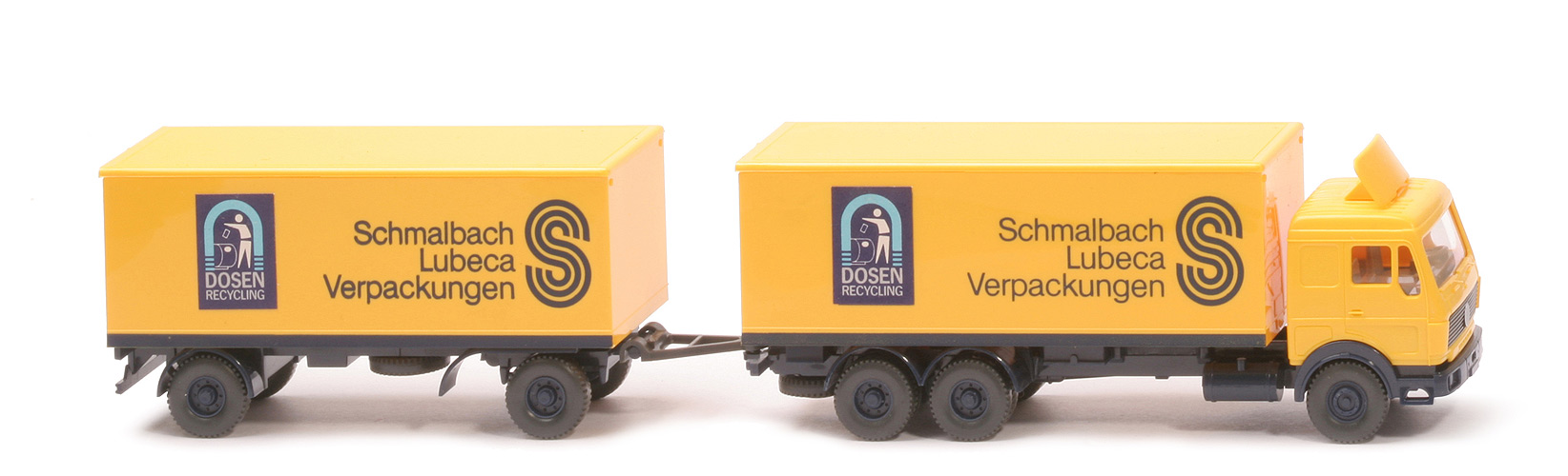 | Zugwagen | Kabine Farbe | gelb | hintere Seitenfenster | geschlossen | Scheibenwischer | mit | Heckfenster | geschlossen | eingesetzter Grill | schwarz, mit MB-Stern, ohne Streifen | Inneneinrichtung | ca. rotelfenbein, mit Lenkrad | Ansaugstutzen | ohne | Stoßstange | stahlblau | Chassis | stahlblau, BP WIKING, Berlin-W | Radlauf hinten | 2-teilig, stahlblau | Reserverad | hinten unter Chassis | Koffer Korpus | gelb | Koffer Dach | gelb | Koffer Türen | gelb | Räder | 12 mm, Felgen 8-Loch, stahlblau | | Anhänger | Koffer Korpus | gelb | Koffer Dach | gelb | Koffer Türen | gelb | Chassis | stahlblau | Drehschemel | stahlblau | Reserverad | mittig unter Chassis | Räder | 12 mm, Felgen 8-Loch, stahlblau | | Beschriftungen | Koffer Seite | Schmalbach... (s. Foto) |