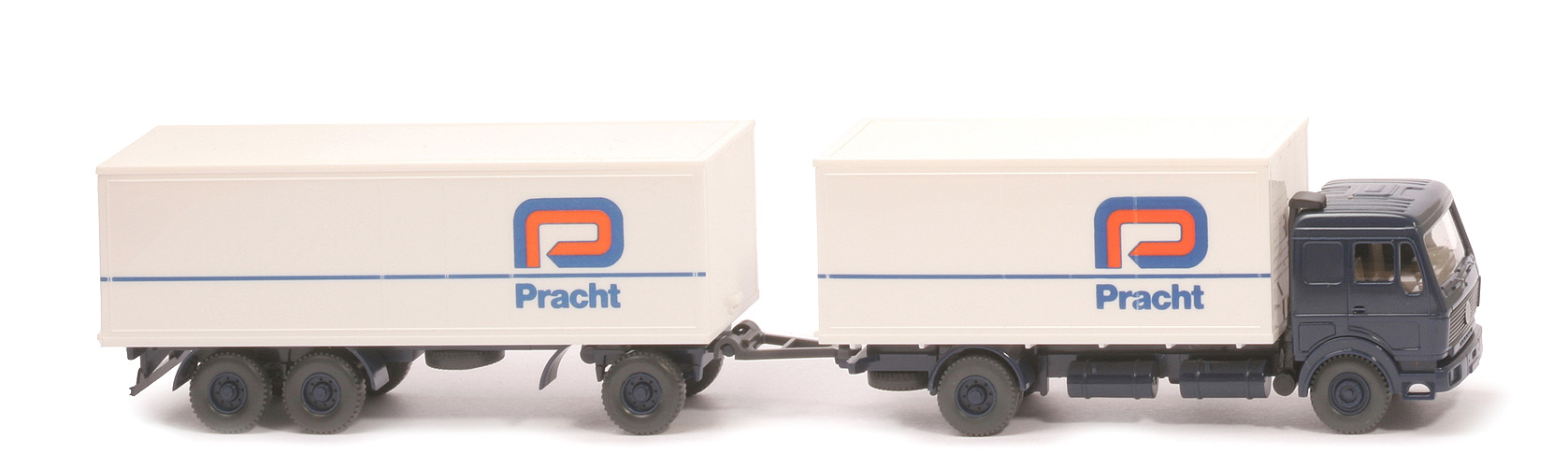 | Zugwagen | Kabine Farbe | stahlblau | hintere Seitenfenster | geschlossen | Scheibenwischer | mit | Heckfenster | geschlossen | eingesetzter Grill | schwarz, mit MB-Stern, ohne Streifen | Inneneinrichtung | ca. graubeige mit Lenkrad | Ansaugstutzen | schwarz, hinter Kabinenrückwand | Stoßstange | stahlblau | Chassis | stahlblau, BP WIKING, Berlin-W | Radlauf hinten | stahlblau | Reserverad | hinten unter Chassis | Koffer Korpus | weiß | Koffer Dach | weiß | Koffer Türen | weiß | Räder | 12 mm, anthrazit | Felgen | 8-Loch, stahlblau | | Anhänger | Koffer Korpus | weiß | Koffer Dach | weiß | Koffer Türen | weiß | Chassis | stahlblau | Achshalterungen | stahlblau | Unterfahrschutz | stahlblau | Reserverad | unter Chassis | Räder | 12 mm, anthrazit | Felgen | 8-Loch, stahlblau | | Beschriftungen | Koffer Seiten | Pracht ... (s. Foto) |