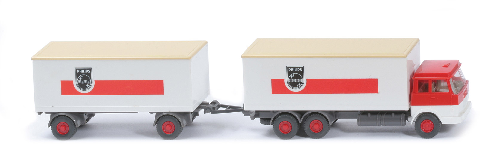 | Zugwagen | Kabine oben | rot | Kabine unten | weiß | Verglasung | klar | Inneneinrichtung | 2 Sitze, Motorblock, ca. graubeige | Lenkrad | mit | Scheinwerfer | unbemalt | Koffer Korpus | weiß | Koffer Dach | hellbeige | Koffer Türen | weiß | Druck | Philips, Balken rot | Chassis | basaltgrau | Radlauf hinten | basaltgrau, zweiteilig | Räder | Profil grob | Felgen | rot | | Hänger | Koffer Korpus | weiß | Koffer Dach | hellbeige | Koffer Türen | weiß | Chassis | basaltgrau | Druck | Philips, Balken orangerot | Räder | Profil grob | Felgen | rot |