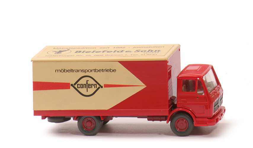Kabine | rot | Spiegelaufnahmen | mit | Grill | eingesetzt, ohne Silberstreifen neben Stern | Verglasung | klar | Inneneinrichtung | Lenkrad integriert, ca. graubeige | Stoßstange, vorderer Kotflügel | rot | Typ vorderer Kotflügel | ohne Wulst, mit Blinkern | Scheinwerfer | unbemalt, mit integrierten Blinkern | Chassis | hellbraunrot | Kardaneinsatz | hellbraunrot | Bodenprägung | Germany, WM | Reserverad | hinten unter Chassis | Kotflügel hinten | rot | Rückleuchten | unbemalt | Aufbau Typ | hoher Koffer | Farbe Koffer | rot | Farbe Türen | hellbeige | Farbe Kofferdach | hellbeige | Bodenprägung Koffer | WIKING, Berlin-W | Beschriftung Seiten | Confern, Möbeltransportbetriebe... (s. Foto) | Beschriftung Dach | Bielefeld & Sohn ... (s. Foto) | Beschriftung Art | Papieraufkleber mit Druck rot/schwarz | Räder | 11mm, Felgen eingesetzt | Felgen | 6-Loch, hellbraunrot |
