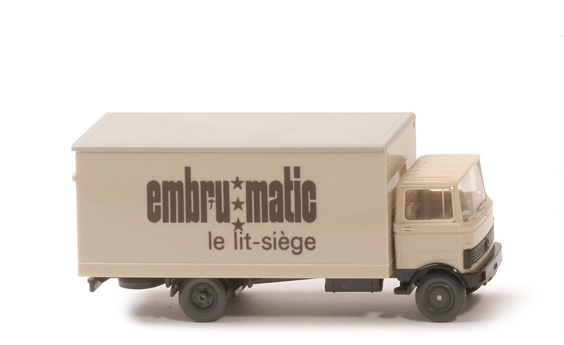 Kabine | hellelfenbein | Spiegelaufnahmen | mit | Grill | schwarz, eingesetzt | Grillbedruckung | ohne | Inneneinrichtung | ca. graubeige, Lkr integriert | Kotflügel, Stoßstange | schwarz | Chassis | schwarz | Kotflügel hinten | schwarz | Bodenprägung | WIKING, Berlin-W | Reserverad | unter Chassis | Koffer Korpus | hellelfenbein | Koffer Dach | silbergrau | Ladebordwand | hellelfenbein | Druck Koffer | "embru : matic" ... (s. Foto) | Räder | 10 mm |