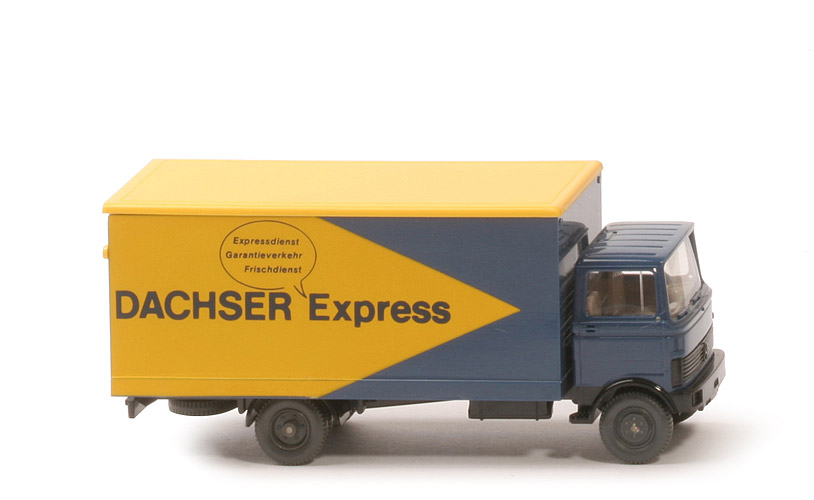 Kabine | stahlblau | Spiegelaufnahmen | mit | Grill | schwarz, eingesetzt | Grillbedruckung | ohne | Inneneinrichtung | ca. graubeige, Lkr integriert | Kotflügel, Stoßstange | schwarz | Chassis | schwarz | Kotflügel hinten | schwarz | Bodenprägung | WIKING, Berlin-W | Reserverad | unter Chassis | Koffer Korpus | stahlblau | Koffer Dach | gelb | Ladebordwand | gelb | Druck Koffer | "Dachser Express" ... (s. Foto) | Druck Art | Negativdruck gelb | Räder | 10 mm |