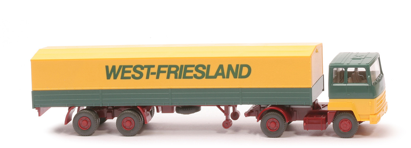 | | Zugmaschine | | Fahrerhaus Typ | Version 2 | | Kabine oben | patinagrün | | Kabine unten | gelb | | Verglasung | klar | | Inneneinrichtung | ca. graubeige, Lkr integriert | | Chassis | weinrot | | Bodenprägung | WIKING Berlin-W | | Sattelpfanne | für großen Königsbolzen | | Radlauf hinten | weinrot | | | Auflieger | | Art | 4-fach-Teilung | | Pritsche Farbe | patinagrün | | Pritsche Typ | Heck trapezförmig | | Pritsche Bodenprägung | Wiking, Berlin-W | | Chassis | weinrot | | Pritscheneinlage | Pappe, silbern | | Plane | gelb, Innenprägung WIKING, <134-15 | | Druck | West-Friesland | | Stützen | als Rollen, integriert | | Doppelachsaggregat | mit Schwingachsen, ähnlich Containertrailer | | Kotflügel | am Aufliegerchassis, gerundet | | Reserverad | unter Chassis gesteckt | | Unterfahrschutz | ohne | | | Räder | | Typ | 12mm, Profil grob | | Felgen | 6-Loch, hellbraunrot |