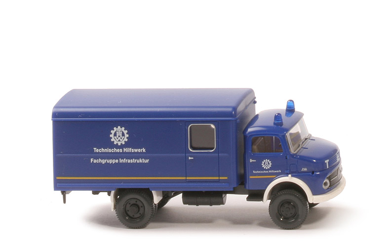 Kabine | dunkelultramarin, mit 2 Warnlichtern blautransparent | Verglasung | klar | Inneneinrichtung | ca. steingrau, Lkr separat | Beschriftung Türen | THW-Logo, "Technisches Hilfswerk" | Grill | separat eingesetzt, schwarz | Bedruckung Grill | Umrandung, Zierlinien, Stern silbern | Scheinwerfer | klar transparent, eingesetzt | Stoßstange, Kotflügel | weiß | Kabine unten | schwarz | Chassis | schwarz | Kardaneinsatz | schwarz | Bodenprägung | neues WIKING-Logo | Zughaken | grazil | Kotflügel hinten | weiß | Koffer Korpus | dunkelultramarin | Kofferdach | dunkelultramarin | Verglasung | klar | Beschriftung Seiten | THW-Logo, "Technisches Hilfswerk, ..." (s. Foto) | Beschriftung Heck | THW-Logo, "Technisches Hilfswerk" | Räder | 11 mm, 2-teilig | Felgen | 6-Loch, schwarz |