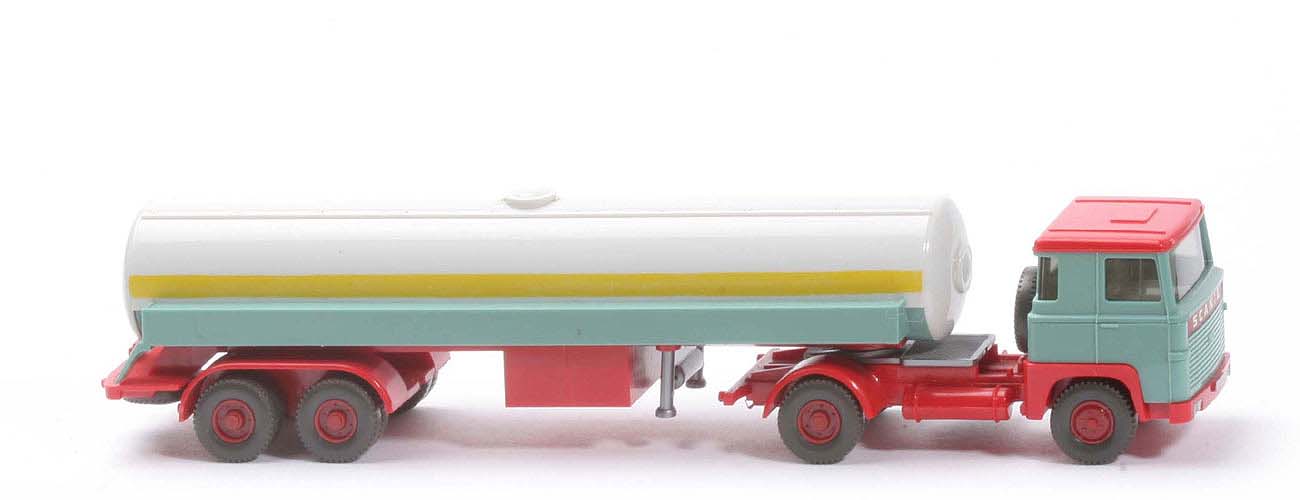 | | Zugmaschine | | Dach | rot | | Kabine oben | türkis | | Kabine unten | türkis | | Stoßstange | rot | | Frontbeschriftung | SCANIA breit | | hier Farbhinterlegung | hellbraunrot | | Grill Prägung | mit 110 | | Scheinwerfer | in der Stoßstange, gesilbert | | Spiegel | ohne | | Scheibenwischer | ohne | | Lenkrad | ohne | | Sattelpfanne | für großen Königsbolzen | | Reserverad | hinter Kab und unter Chassis | | Chassis Farbe | rot | | Rücklichtstangen | mit | | Räder | 12mm, Profil grob | | Felgen | hellbraunrot | | | Auflieger | | Tank | altweiß | | Galerie | türkis | | Chassis | rot | | Achseinheit | rot | | Stütze | Hydraulikstempel, silber | | Reserverad | hinter Achseinheit | | Beschriftung Heck | ohne | | gelber Streifen | mit | | Räder | 12mm, Profil grob | | Felgen | hellbraunrot |