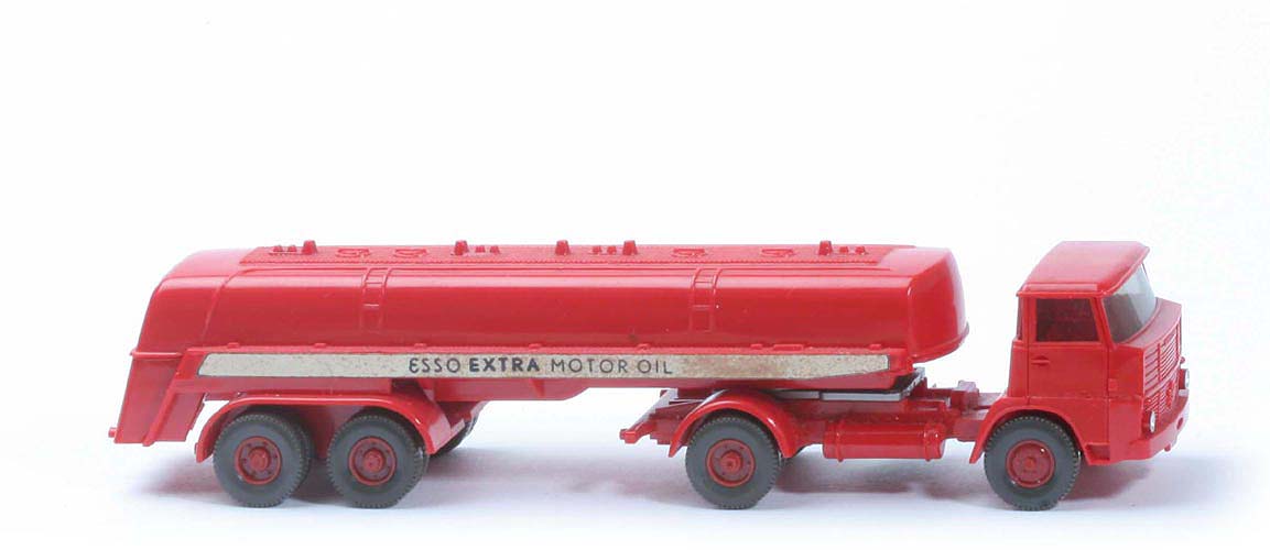 | Zugmaschine | Kabine oben | rot | Kabine unten | rot | Verglasung | getönt | Chassistyp | neu | Zughaken | ohne | Fläche hinter Sattelpfanne | 3 Stege | Chassisfarbe | rot | Sattelpfanne | für großen Königsbolzen | Reserverad | unter Chassis gesteckt | Räder | 12mm, Profil fein | Felgen | hellbraunrot | | Auflieger | Farbe Korpus, Unterteil | rot | Farbe Achseinheit | rot | Typ Achseinheit | Germany/Wiking | Königsbolzen | stark | Reserverad | ohne | Beschriftung Seite | Esso EXTRA ... (s. Foto) | Schriftfarbe Seite | dunkelblau | Beschriftung Heck | Esso Logo | Räder | 12mm, Profil fein | Felgen | hellbraunrot |