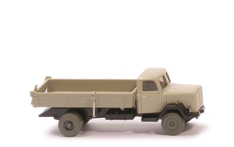 | Farbe Kabine | hellgelbgrau | | Verglasung | getönt | | Bemalung vorn | Scheinwerfer, Kennzeichen silbern, Blinker rot | | Chassis Farbe | schwarz | | Chassis Art | Version 1 | | hinterer Chassisbereich | offen | | Chassis Bodenprägung | WM | | Abdeckplatte des Kipphebels | schwarz | | Kippscharnier | silbern | | Pritsche Art | Flachbord ohne Wulst | | Pritsche Farbe | hellgelbgrau | | bewegliche Heckklappe | hellgelbgrau | | Rückleuchten und Kennzeichen | an Pritsche | | Bemalung hinten | Rückleuchten rot | | Kipphebel | auf Beifahrerseite | | Räder | 10 mm, 10 Loch |