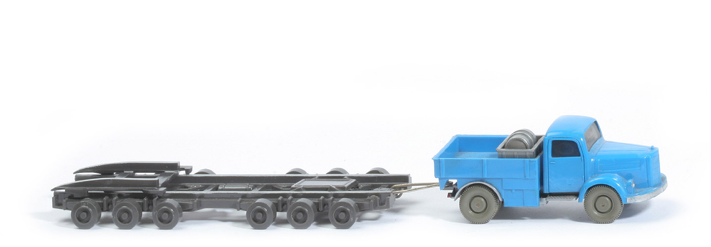 | Zugmaschine | Farbe Kabine | himmelblau | Version Kabine | mit Schlitz hinter Nrn-Schild | Blinker | ohne | Verglasung | getönt | Dach | glatt | Bemalung | Scheinwerfer, Nummernschild | Chassis | Version 3a | Achshalterungen | offen | Chassis Farbe | silbern | Bodenprägung | WM und Made in Germany | Pritsche | himmelblau | Ladung | Kiste mit Öltonne | Farbe Tonne | silbern | Räder | 11mm, glatt | | Anhänger Culemeyer | Farbe | anthrazit | Bodenprägung | WM im Kreis und Wiking Germany | Bremsplatte | Fläche mit Kastenprägung | Bemalung | Gleise silbern | Deichsel | Metall | Räder | Walzenräder 7,8mm o. Profil | Farbe Räder | anthrazit |