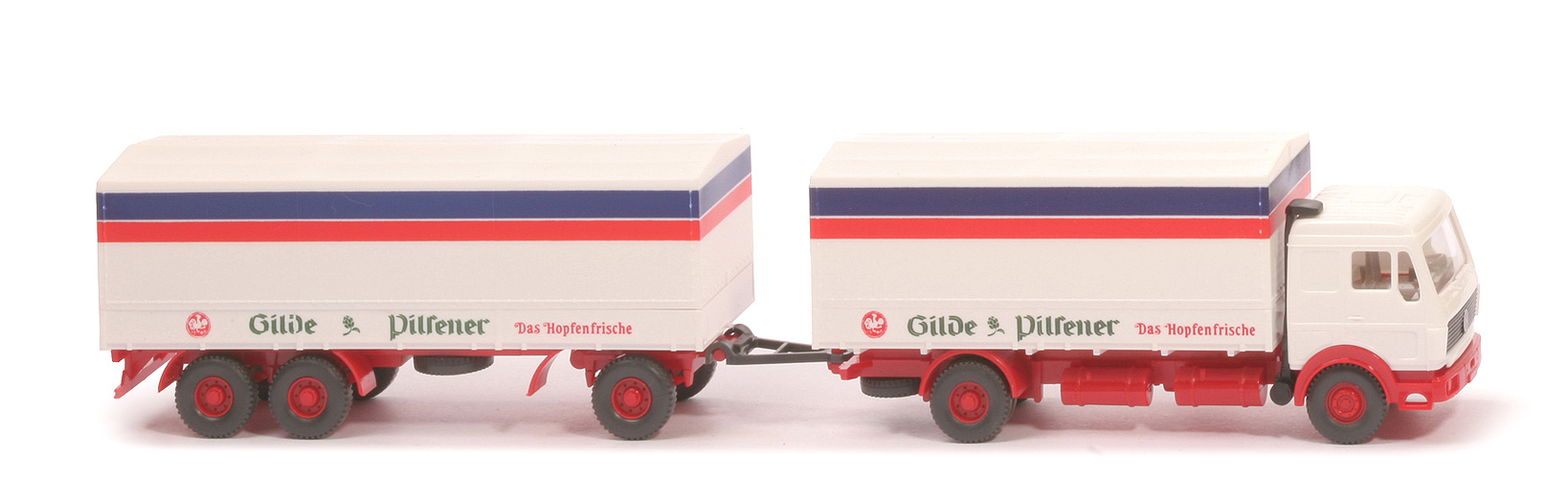 | | Zugwagen | | Kabine Farbe | weiß | | hintere Seitenfenster | geschlossen | | Scheibenwischer | mit | | Heckfenster | geschlossen | | eingesetzter Grill | schwarz, mit MB-Stern, ohne Streifen | | Inneneinrichtung | ca. graubeige, Lenkrad integriert | | Ansaugstutzen | schwarz, hinter Kabinenrückwand | | Stoßstange | rot | | Chassis | rot, BP WIKING, Berlin-W | | Radlauf hinten | rot | | Reserverad | hinten unter Chassis | | Pritsche | Glattwand, weiß | | Plane | weiß | | Räder | 12 mm, Profil grob | | Felgen | 8-Loch, rot | | | Anhänger | | Chassis | rot | | Achshalterungen | rot | | Unterfahrschutz | mit | | Reserverad | unter Chassis | | Pritsche | Glattwand, weiß | | Plane | weiß | | Räder | 12 mm, Profil grob | | Felgen | 8-Loch, rot | | | Beschriftungen | | Pritschen | Gilde Pilsener (... s. Foto) | | Planen | Farbbänder blau/rot (s. Foto) |
