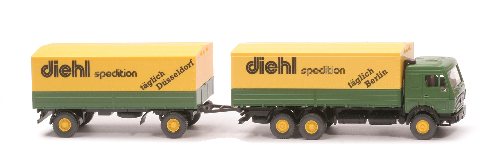 | Zugwagen | Kabine Farbe | maigrün | hintere Seitenfenster | geschlossen | Scheibenwischer | mit | Heckfenster | geschlossen | eingesetzter Grill | schwarz, mit MB-Stern, ohne Streifen | Inneneinrichtung | ca. rotelfenbein, mit Lenkrad | Ansaugstutzen | schwarz, hinter Kabinenrückwand | Stoßstange | schwarz | Chassis | schwarz, BP WIKING, Berlin-W | Radlauf hinten | 2-teilig, schwarz | Reserverad | hinten unter Chassis | Pritsche | maigrün | Pritscheneinlage | Pappe, silbern | Plane | gelb | Räder | 12 mm, Felgen 8-Loch, gelb | | Anhänger | Pritsche | maigrün | Pritscheneinlage | Pappe, silbern | Plane | gelb | Chassis | schwarz | Drehschemel | schwarz | Reserverad | mittig unter Chassis | Räder | 12 mm, Felgen 8-Loch, gelb | | Beschriftungen | Planen Seite | diehl ... (s. Foto) | Planen hinten | diehl spedition |