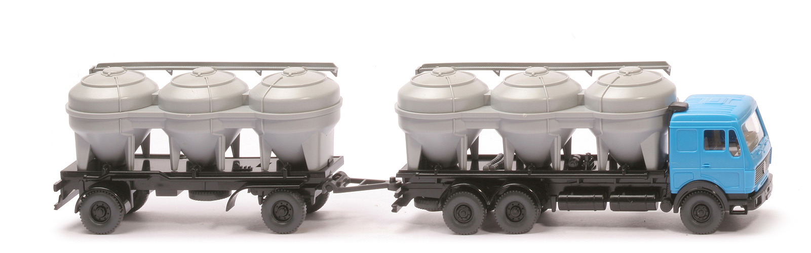 | Zugwagen | Kabine Farbe | himmelblau | hintere Seitenfenster | geschlossen | Scheibenwischer | mit | Heckfenster | geschlossen | eingesetzter Grill | schwarz, mit MB-Stern, ohne Streifen | Inneneinrichtung | ca. rotelfenbein, mit Lenkrad | Ansaugstutzen | schwarz, hinter Kabinenrückwand | Stoßstange | schwarz | Chassis | schwarz, BP WIKING, Berlin-W | Radlauf hinten | 2-teilig, schwarz | Unterbau Silo | schwarz | Siloaufbau | silbergrau | Galerie, Leiter | silbern | Räder | schwarz, Profil grob | Felgen | 8-Loch, schwarz | | Anhänger | Chassis | schwarz | Achshalterungen | schwarz | Unterfahrschutz | mit | Unterbau Silo | schwarz | Siloaufbau | silbergrau | Galerie, Leiter | silbern | Räder | schwarz, Profil grob | Felgen | 8-Loch, schwarz | | Beschriftungen | komplett | ohne |