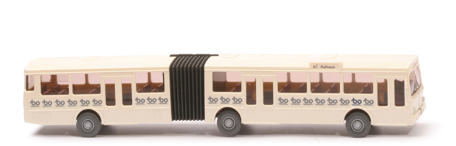 | Farbe Karosserie | cremeweiß | | Bemalung vorne | Scheinwerfer silbern | | Verglasung | klar | | Gelenkbereich | schwarzer Weichkunststoff | | Sitze | hellbraunrot | | Fahrer | anthrazit | | Fahrer Typ | Standard-Busfahrer | | Bemalung Fahrer | Gesicht | | Lenkrad | anthrazit | | Bemalung Heck | ohne | | Chassis Farbe | anthrazit | | Chassis Typ | mit Trapez | | Bodenprägung | WIKING, Berlin-W | | Räder | 12mm, Profil grob | | Radkappen | silber | | Zielangaben | 6 | Rathaus | | Beschriftung | 100 Jahre, Seiten und Heck umlaufend | | Beschriftung Art | Druck grau/stahlblau |