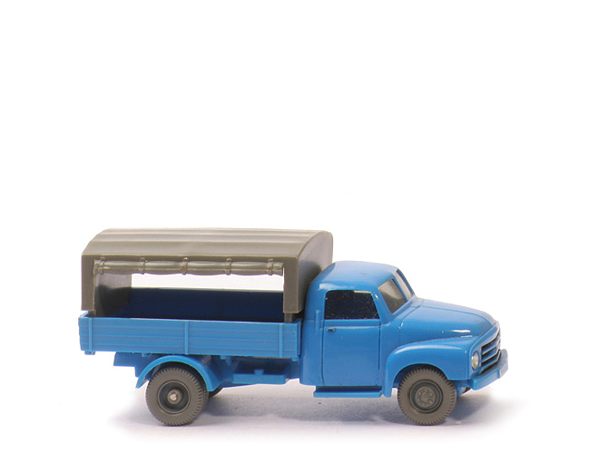 Kabine | himmelblau | Verglasung | getönt | Inneneinrichtung | ohne | Bemalung Front | Scheinwerfer, Kennzeichen silbern | Pritsche Farbe | himmelblau | Pritsche Typ | abgestufte schräge Verbretterung | Rücklichter | beidseits, eins am Kennzeichen | Chassis Farbe | himmelblau | Bodenprägung | nur WM | Zughaken | ohne | Bemalung Rückleuchten | rot | Bemalung Kennzeichen hinten | silbern | Plane Farbe | steingrau | Plane Innenprägung | WM ohne Kreis | Räder Typ | 9 mm | Räder Farbe | ca. betongrau |