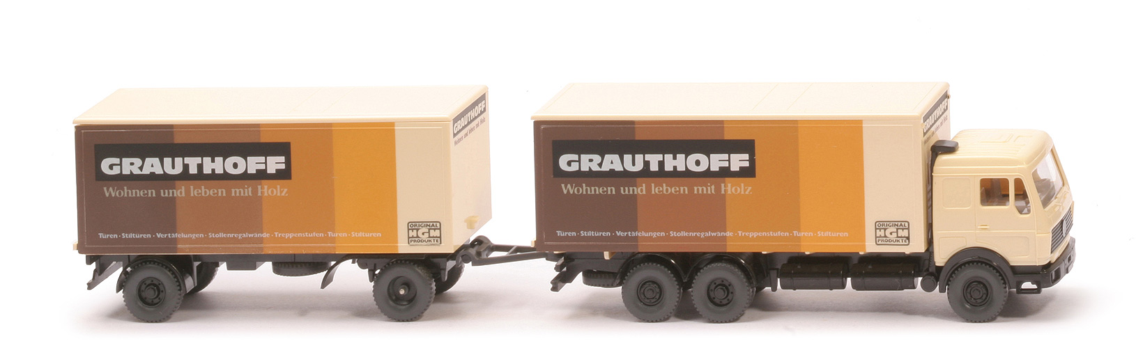 | | Zugwagen | | Kabine Farbe | creme | | hintere Seitenfenster | geschlossen | | Scheibenwischer | mit | | Heckfenster | geschlossen | | eingesetzter Grill | schwarz, mit MB-Stern, ohne Streifen | | Inneneinrichtung | ca. rotelfenbein, mit Lenkrad | | Ansaugstutzen | schwarz, hinter Kabinenrückwand | | Stoßstange | schwarz | | Chassis | schwarz, BP WIKING, Berlin-W | | Radlauf hinten | 2-teilig, schwarz | | Reserverad | hinten unter Chassis | | Koffer Korpus | creme | | Koffer Dach | creme | | Koffer Türen | creme | | Räder | 12 mm, Felgen 8-Loch, schwarz | | | Anhänger | | Koffer Korpus | creme | | Koffer Dach | creme | | Koffer Türen | creme | | Chassis | schwarz | | Drehschemel | schwarz | | Reserverad | mittig unter Chassis | | Räder | 12 mm, Felgen 8-Loch, schwarz | | | Beschriftungen | | Koffer Seite | Grauthoff ... (s. Foto) | | Koffer vorne | Grauthoff... |