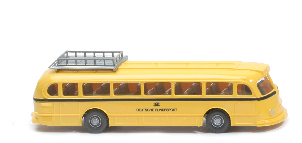 | Verglasung | mit | | Farbe Karosserie | gelb | | Dach Mittelbereich | mattiert mit Lüftern | | Kombination Dach/Gepäckbrücke | Kombination 5 | | Verglasung | klar | | Sitze | silbern | | Fahrer | anthrazit | | Lenkrad | 4-speichig | | Heck | mit angedeuteter Kupplung | | Gepäckbrücke | silbern, mit Steg | | Chassis Farbe | silbern | | Chassis Typ | Struktur, BP Wiking Germany | | Bemalung vorne | Scheinwerfer silbern | | Bemalung Heck | Rückleuchten rot | | Beschriftung | Deutsche Bundespost | | Beschriftung Art | Druck | | weitere Bedruckung | schwarzer umlaufender Streifen | | Räder | 12mm, Profil grob | | Radkappen | silbern eingesetzt |