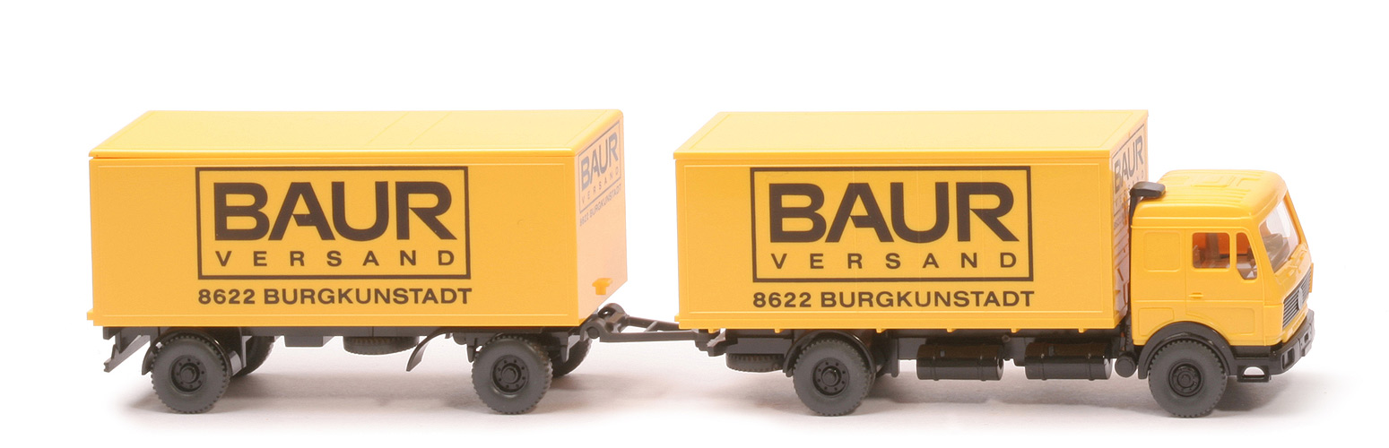 | | Zugwagen | | Kabine Farbe | gelb | | hintere Seitenfenster | geschlossen | | Scheibenwischer | mit | | Heckfenster | geschlossen | | eingesetzter Grill | schwarz, mit MB-Stern, ohne Streifen | | Inneneinrichtung | ca. graubeige mit Lenkrad | | Ansaugstutzen | schwarz, hinter Kabinenrückwand | | Stoßstange | schwarz | | Chassis | schwarz, BP WIKING, Berlin-W | | Radlauf hinten | schwarz | | Reserverad | hinten unter Chassis | | Koffer Korpus | gelb | | Koffer Dach | gelb | | Koffer Türen | gelb | | Räder | 12 mm, anthrazit | | Felgen | 8-Loch, schwarz | | | Anhänger | | Koffer Korpus | gelb | | Koffer Dach | gelb | | Koffer Türen | gelb | | Chassis | schwarz | | Achshalterungen | schwarz | | Unterfahrschutz | schwarz | | Reserverad | unter Chassis | | Räder | 12 mm, anthrazit | | Felgen | 8-Loch, schwarz | | | Beschriftungen | | Koffer Seiten | Baur ... (s. Foto) |