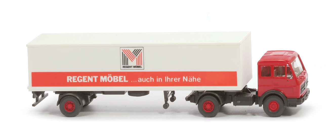 | Zugmaschine | Kabine | rot | eingesetzter Grill | schwarz, mit Streifen | Lüfter | flach | Heckfenster | offen | Spiegelaufnahmen | mit | Inneneinrichtung | ca. hellolivgrau | Stoßstange | anthrazit | Chassis | anthrazit | Radlauf hinten | anthrazit | Reserverad | ohne | Räder | Profil grob | Felgen | 8-Loch, rot | | Auflieger | Koffer Korpus | weiß | Dach | weiß | Türen | weiß | Beschriftung | Regent Möbel | Beschriftung Art | Druck | Chassis | anthrazit | Einachsaggregat | anthazit | Bodenprägung Chassis | WIKING, Berlin-W | Unterfahrschutz | mit | Königsbolzen | stark | Hydraulikstütze | anthrazit | Räder | Profil grob | Felgen | 8-Loch, rot |