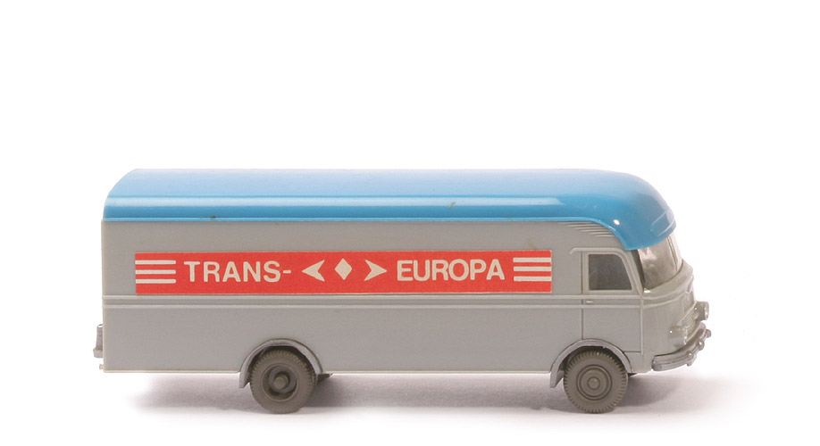 | | Zugwagen | | Aufbau Farbe | silbergrau | | Blinker vorne | ohne | | Verglasung | klar | | Inneneinrichtung | silbern | | Fahrer | ohne | | Kotflügel | Teil des Chassis | | Rückleuchten | groß | | Dach Farbe | lichtblau | | Dach Art | glänzend, ohne Positionsleuchten | | Türen | silbergrau, mit Knopf | | Türen Art | Typ 1: hoch, ohne Rand, mit Knopf | | Chassis Art | Typ 1 | | Chassis Farbe | silbern | | Bodenprägung Motorblock | WM | | Bodenprägung hinten | ohne | | Achshalterung vorne | geschlossen | | Achshalterung hinten | geschlossen | | Fläche unter hinterem Kardan | offen | | Fläche hinter Hinterachse | offen | | Tank | ohne | | Beschriftung | Trans Europa | | Beschriftung Art | Papieraufkleber, Druck weiß auf rot | | Räder | 10mm hellgrau, alt |