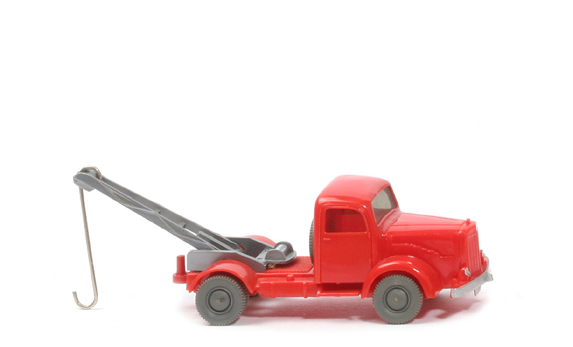 Neue Radvariante (ab 1960). Sie ist deutlich seltener als die alte und weicht auch minimal, aber kaum sichtbar, im Farbton von der Erstproduktion ab. Sie floss wohl neben dem Weiterverkauf der 1. Variante mit alten Rädern sukzessiv in den Abverkauf orangeroter Modelle bis weit in das Jahr 1961 mit ein. 1961 wechselte das Katalogbild vom MB L 5000 auf den MB L 3500, so dass angenommen werden darf, dass ab Herbst 1961 die Abschleppwagen von orangeroten L 5000 auf rote L 3500 Modelle wechselten. |