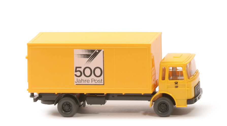 | Fahrerhaus | gelb | | Verglasung | klar | | Inneneinrichtung | ca. graubeige, mit integriertem Lkr | | Grill | schwarz, eingesetzt | | Scheinwerfer | ungesilbert | | Chassis | schwarz, Bodenprägung WIKING Berlin-W | | Zughaken | kurz (ca. 5 mm) | | Radlauf hinten | schwarz | | Reserverad | hinten unter Chassis | | Koffer | gelb | | Kofferdach | gelb | | Ladebordwand | gelb | | Räder | 11 mm, Profil fein, Felgen eingesetzt | | Felgen | 8-Loch, schwarz | | Beschriftung Türen | stilisiertes Posthorn, "DBP" | | Beschriftung Koffer | Logo 500 Jahre Post |