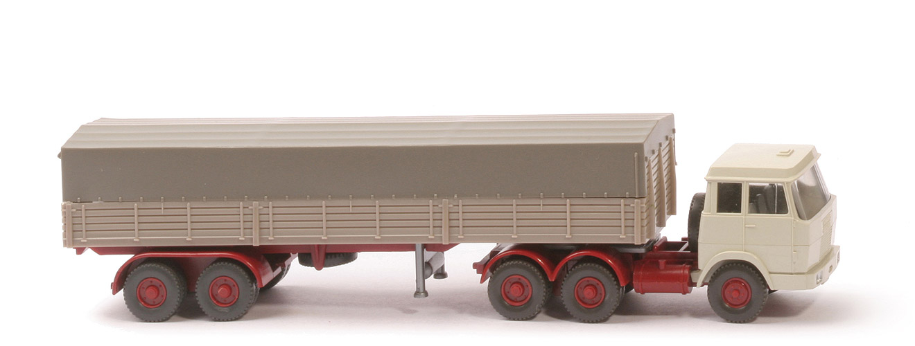 | Zugmaschine | Kabine oben | perlweiß | Kabine unten | perlweiß | Verglasung | klar | Inneneinrichtung | 3 Sitze, ca. silbergrau | Lenkrad | ohne | Chassis | hellbraunrot | Radlauf hinten | hellbraunrot, 2-teilig | Sattelpfanne | für großen Königsbolzen | Reserverad | hinter Kabine | Räder | Profil grob | Felgen | hellbraunrot | | Auflieger | Farbe Pritsche | graubeige | Pritschentyp | Holzpritsche mit Lasche | Chassis | hellbraunrot | Königsbolzen | stark | Pritscheneinlage | ca. silbergrau | Doppelachsaggregat | Klemmplatte | Doppelachsaggregat Farbe | hellbraunrot | Bodenprägung Achseinheit | Germany, Wiking | Reserverad | ja | Stütze | starr, silbern, Hydraulikstempel | Plane | ca. steingrau | Plane Art | Seite 1 Mark., vorne offen | Beschriftung | ohne | Räder | Profil grob | Felgen | hellbraunrot |