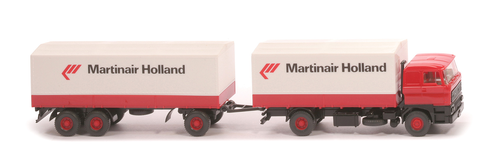 | Zugwagen | Kabine | rot | eingesetzter Grill | schwarz | Inneneinrichtung | ca. graubeige, Lkr integriert | Kabinenunterteil | schwarz, Scheinwerfer gesilbert | Luftansaugstutzen | schwarz | Chassis | schwarz | Bodenprägung | WIKING, Germany | Radlauf hinten | schwarz | Reserverad | unter Chassis | Pritsche | rot | Pritscheneinlage | Pappe, silbern | Plane | weiß | Räder | 12 mm | Felgen | 8-Loch, rot | | Anhänger | Pritsche | rot | Pritscheneinlage | Pappe, silbern | Plane | weiß | Chassis | schwarz | Bodenprägung | WIKING, Berlin-W | Doppelachsaggregat | schwarz | Drehschemel | schwarz | Räder | 12 mm, anthrazit | Felgen | 8-Loch, rot | | Beschriftung | Planen seitlich | "Martinair Holland" | Planen hinten | startendes Flugzeug |