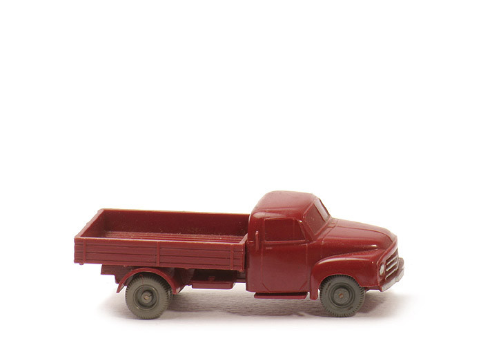 | Achsen | Rollachser | | Kabine | weinrot | | Bemalung Front | Scheinwerfer, Grill, Stoßstange silbern | | Pritsche Farbe | weinrot | | Pritsche Typ | gerade Verbretterung | | Rücklicht | nur eins am Kennzeichen | | Chassis Farbe | weinrot | | Bodenprägung | WM vor Vorderachse | | Zughaken | ohne | | Bemalung Rückleuchte | rot | | Bemalung Kennzeichen hinten | silber | | Räder Typ | 9 mm | | Räder Farbe | ca. staubgrau |