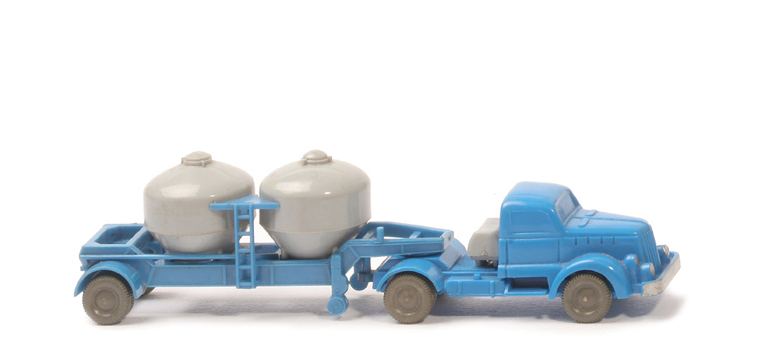 Achsen | Rollachser | | Zugmaschine | Farbe Kabine | himmelblau | Farbe Chassis | himmelblau | Bemalung | Scheinwerfer, Stoßstange | Sattelpfanne | eingesetzt, in Chassisfarbe | Chassis | Version 1a | Achshalterungen | geschlossen | Bodenprägung | WM (ohne Kreis) | Werkzeugkiste | silbergrau, hinter Kabine | Räder | 10 mm, mit Profil, staubgrau | | Auflieger | Aufbau | lichtblau | Leiterelement | lichtblau | Zementbehälter | silbergrau | Typ Zementbehälter | unten geschlossen | Bemalung Rückleuchten | ohne | Bemalung Kennzeichen | silber | Räder | 10 mm, mit Profil, staubgrau |