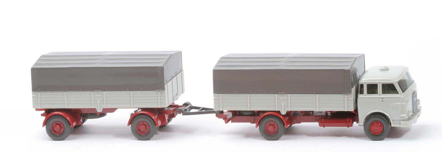 | Pritschenwagen | Fahrerhaus | lichtgrau | Verglasung | klar | Sitze | hellgelbgrau | Grill | silbern | Scheinwerfer | bemalt | Chassis | hellbraunrot | Pritsche | lichtgrau | Reserverad | unter Pritsche, hinten, 11mm | Pritscheneinlage | silbern | Zughaken | Dreieck | Plane | basaltgrau | Räder | Profil grob 12mm | Felgen | hellbraunrot | | Anhänger | Pritsche | lichtgrau | Chassis | hellbraunrot | Deichsel | Kunststoff | Reserverad | mittig unter Chassis | Räder | Profil grob 12mm | Felgen | hellbraunrot | Plane | basaltgrau |