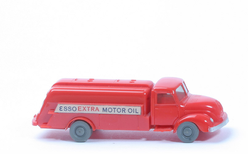 Farbe Kabine | orangerot | Version Kabine | Typ 3a | Stoßstange | abgeschrägt | Kabinenboden | ohne Schlitz | Verglasung | schwach getönt | Bemalung | Scheinwerfer, Stoßstange | Version Chassis | Version 2 | Achshalterungen | geschlossen | Chassis Farbe | orangerot | Chassis Bodenprägung | WM (ohne Kreis) | Chassisplatte Farbe | orangerot | Chassisplatte Prägung | WM und Wiking | Chassisplatte Grösse | Typ 2 (Fläche 11 x 15mm) | Tank | blassrot | Beschriftung | ESSO... (s. Foto) | Beschriftung Seite | Papieraufkleber | Beschriftung Heck | Papieraufkleber | Schrift EXTRA | in rot | Bemalung hinteres Nrn.-Schild | silber | Räder | 10mm, neuere Ausführung |