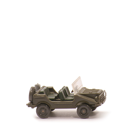 Farbe Karosserie | olivgrün | senkrechte Streben am Heck | mit | Rückleuchten | mit | Frontscheibe | klar transparent, eingeklebt | Lenkrad | anthrazit, 3-speichig | Sitze vorne | tannengrün | Sitze hinten | tannengrün | Chassis Farbe | olivgrün | Achshalterungen | offen | Bodenprägung | WM | Reserverad | rechts angeklebt | Benzinkanister | links angeklebt, silbern | Bemalung Scheinwerfer | ohne | Bemalung Rückleuchten | ohne | Räder Typ | 8 mm, Profil grob | Räder Farbe | anthrazit |