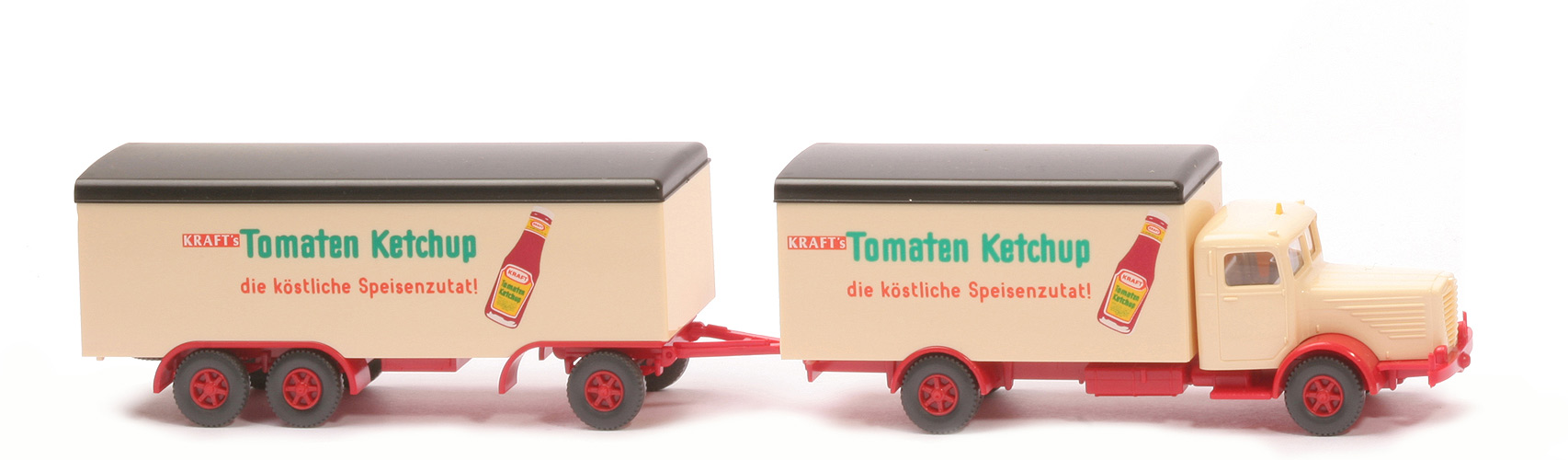 | Zugwagen | Kabine | creme | Verglasung | klar | Inneneinrichtung | ca. graubeige | Lenkrad | integriert | Bedruckung Scheinwerfer | ohne | Bedruckung Grill | ohne | Warndreieck | gelb | Chassis Farbe | rot | Chassis Typ | geschlossen (nur bis 1994) | Bodenprägung | neues WIKING-Logo, Berlin-W, Germany | Zughaken | klein | Reserverad | auf Chassis | Bedruckung Rückleuchten | ohne | Koffer Korpus | creme | Koffer Türen | creme | Dach | schwarz | | Anhänger | Koffer Korpus | creme | Koffer Türen | creme | Dach | rot | Chassis | rot, geschlossen (nur bis 1994) | Drehschemel | rot | Deichsel | Öse dünn | | Bedruckung | Koffer | "Kraft", ... (siehe Foto) | | Räder | Typ | 12 mm, Felgen eingesetzt | Felgen | Trilexfelgen, rot |