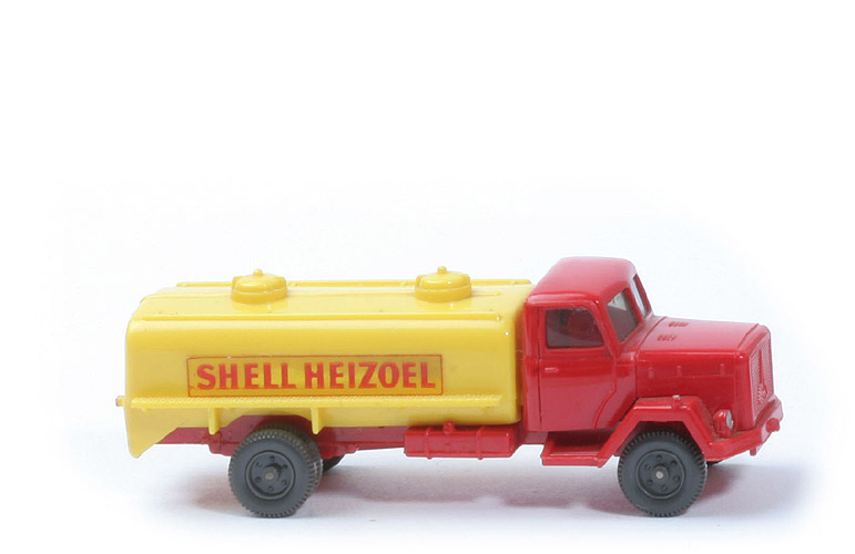 | Kabine | rot | | Verglasung | leicht getönt | | Inneneinrichtung | ohne | | Bemalung vorn | Scheinwerfer silber | | Chassis Farbe | rot | | Chassis Art | Version 4 | | Bodenprägung | WM und Germany | | Tank | zinkgelb | | Beschriftung Seite | SHELL HEIZÖL (s. Foto) | | Art der Beschriftung | Papieraufkleber | | Bemalung Rückleuchten | rot | | Räder | 11mm, 6-Loch, anthrazit |