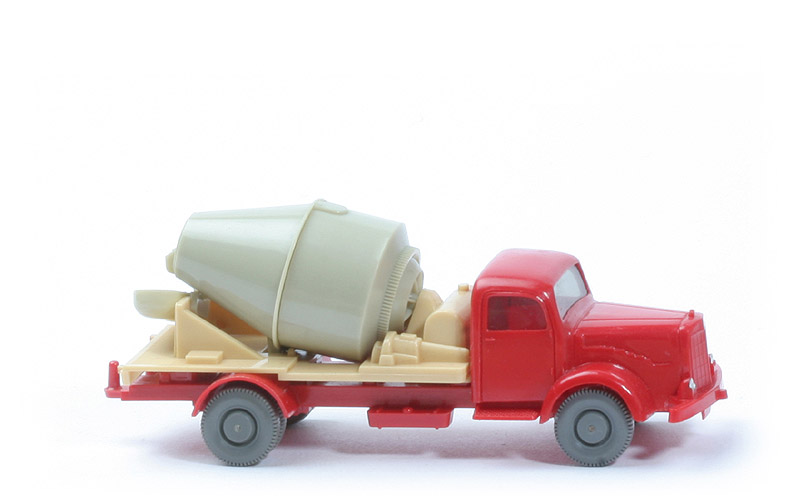 Farbe Kabine | rot | Version Kabine | mit Schlitz hinter Nrn-Schild | Blinker | ohne | Verglasung | getönt | Blinker | ohne | Bemalung | Scheinwerfer | Chassis Farbe | rot | Chassis Art | Version 3b | Achshalterungen | offen | Chassis Bodenprägung | WM (ohne Kreis) und Made in .. | Zughaken | integriert | Rückleuchten am Chassis | mit | Aufbau | hellbeige, verklebt | Trommel | hellgrünbeige | Schütte | hellgrünbeige | Räder | 11 mm glatt |