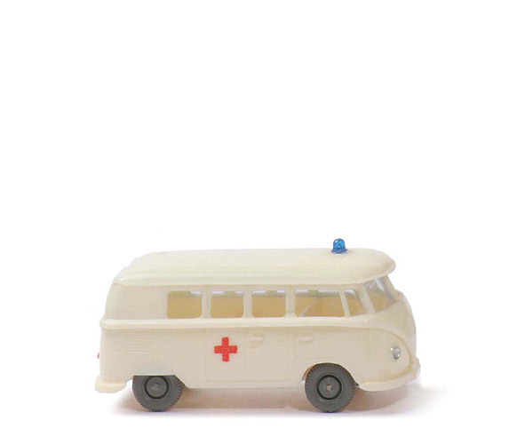 Farbe Karosserie oben | cremeweiß | Farbe Karosserie unten | cremeweiß | Heckscheibe | klein | Chassis | Teil des Karosserieunterteils | Chassis Version | Typ A Nest 2 | Bodenprägung | Made in Germany, WM | Rückleuchten | gering erhaben | Mittelholm | oben gerade | Verglasung | Typ 1, klar | Inneneinrichtung | ohne | Dachaufbau | ohne | Blaulicht | auf dem Dach verklebt | Rotes Kreuz | Druck | Bemalung Scheinwerfer | silbern | Bemalung VW-Emblem | ohne | Bemalung Stoßstangen | ohne | Bemalung Kennzeichen hinten | ohne | Bemalung Rückleuchten | rot | Räder | 8 mm, ca. basaltgau, Nabe flach |