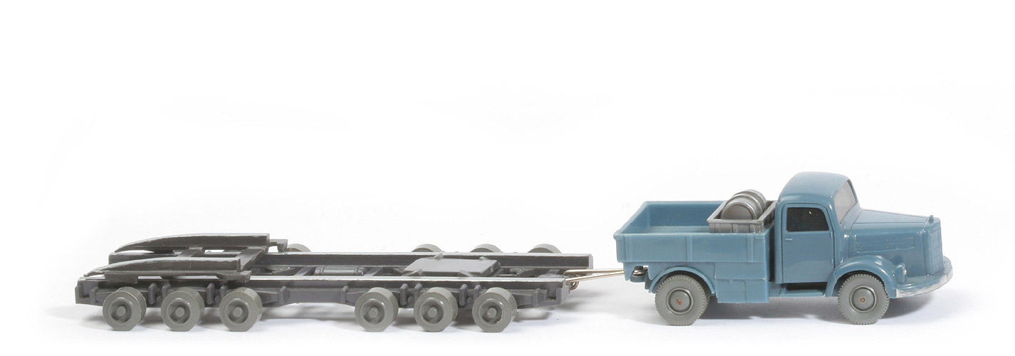 | Zugmaschine | Farbe Kabine | helles ozeanblau | Version Kabine | mit Schlitz hinter Nrn-Schild | Blinker | ohne | Verglasung | getönt | Dach | glatt | Bemalung | Scheinwerfer, Nummernschild | Chassis | Version 2 | Achshalterungen | geschlossen | Chassis Farbe | mattgraublau | Bodenprägung | WM ohne Kreis | Pritsche | mattgraublau | Ladung | Kiste mit Öltonne | Farbe Tonne | silbern | Räder | 10mm, neuere Ausführung | | Anhänger Culemeyer | Farbe | anthrazit | Bodenprägung | WM im Kreis | Bremsplatte | Fläche glatt | Bemalung | Gleise silbern | Deichsel | Metall | Räder | Walzenräder 7,8mm o. Profil | Farbe Räder | basaltgrau |