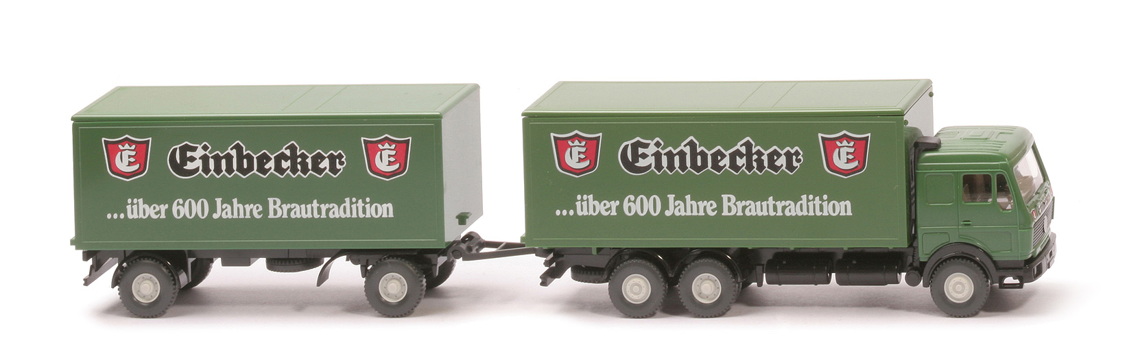 | Zugwagen | Kabine Farbe | laubgrün | hintere Seitenfenster | geschlossen | Scheibenwischer | mit | Heckfenster | geschlossen | eingesetzter Grill | schwarz, mit MB-Stern, ohne Streifen | Inneneinrichtung | ca. rotelfenbein, mit Lenkrad | Ansaugstutzen | schwarz, hinter Kabinenrückwand | Stoßstange | schwarz | Chassis | schwarz, BP WIKING, Berlin-W | Radlauf hinten | 2-teilig, schwarz | Reserverad | hinten unter Chassis | Koffer Korpus | laubgrün | Koffer Dach | laubgrün | Koffer Türen | laubgrün | Räder | 12 mm, Felgen 8-Loch, altweiß | | Anhänger | Koffer Korpus | laubgrün | Koffer Dach | laubgrün | Koffer Türen | laubgrün | Chassis | schwarz | Drehschemel | schwarz | Reserverad | mittig unter Chassis | Räder | 12 mm, Felgen 8-Loch, altweiß | | Beschriftungen | Kabine vorne | Einbecker | Koffer Seite | Einbecker ... (s. Foto) | Koffer Türen | Einbecker ... |