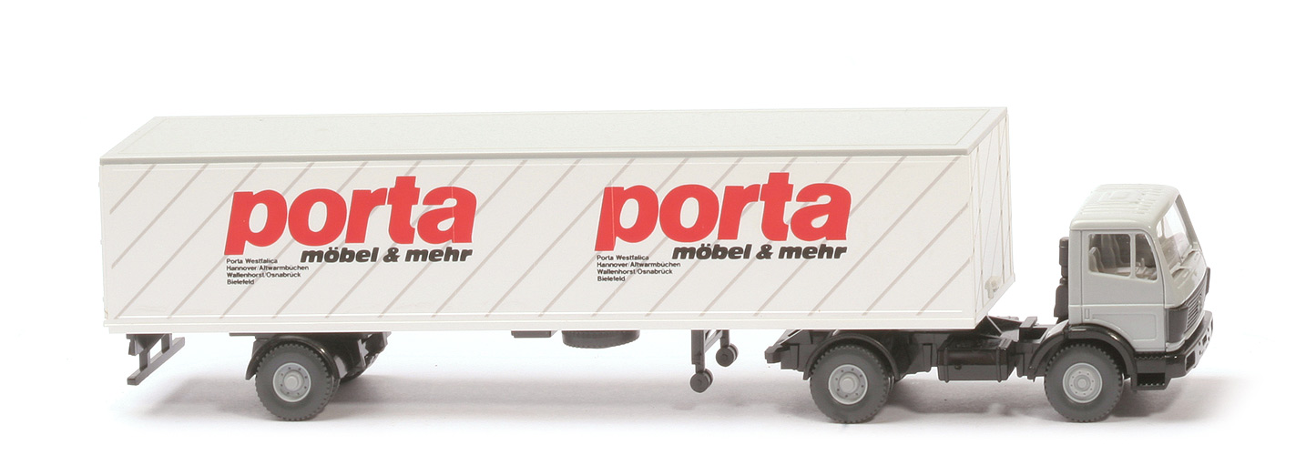 | | Zugmaschine | | Kabine | silbergrau | | eingesetzter Grill | schwarz, eingesetzt, umlaufend | | Typ Grill | Stern silbern, eingesetzt | | Inneneinrichtung | Lenkrad separiert, ca. platingrau | | Ansaugstutzen | schwarz, hinter Kabine | | Stoßstange, Radlauf vorn | schwarz | | Chassis | schwarz | | Radlauf hinten | schwarz | | Reserverad | ohne | | Räder | Profil grob | | Felgen | 8-Loch, silbergrau | | | Auflieger | | Koffer Korpus | weiß | | Dach | silbergrau | | Türen | weiß, stilisiert, nicht zum Öffnen | | Beschriftung Seiten | "porta, möbel & mehr, ...." (s. Foto) | | Beschriftung Heck | "porta, möbel & mehr, ...." | | Beschriftung Art | Druck, rot, schwarz, silbergrau | | Chassis | schwarz | | Einachsaggregat | schwarz | | Bodenprägung Chassis | WIKING, Berlin-W | | Unterfahrschutz | mit | | Königsbolzen | stark | | Hydraulikstütze | schwarz, mit Rollen | | Räder | Profil grob | | Felgen | 8-Loch, silbergrau |
