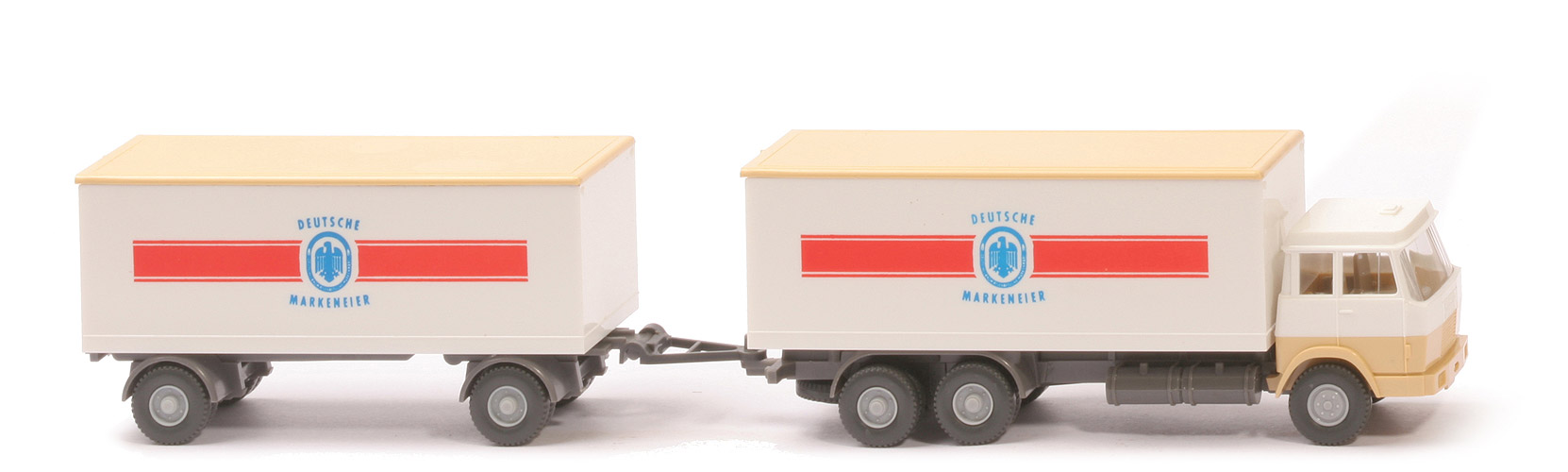 | Zugwagen | Kabine oben | weiß | Kabine unten | hellbeige | Verglasung | klar | Inneneinrichtung | 2 Sitze, Motorblock, graubeige | Lenkrad | ohne | Scheinwerfer | unbemalt | Koffer Korpus | weiß | Koffer Dach | hellbeige | Koffer Türen | weiß | Druck | Deutsche Markeneier | Chassis | basaltgrau | Radlauf hinten | basaltgrau, einteilig | Räder | Profil grob | Felgen | silbergrau | | Hänger | Koffer Korpus | weiß | Koffer Dach | hellbeige | Koffer Türen | weiß | Chassis | basaltgrau | Druck | Deutsche Markeneier | Räder | Profil grob | Felgen | silbergrau |