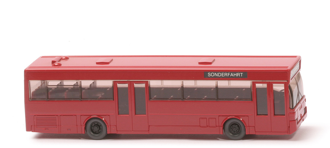 | Farbe Dach | rubinrot | | Farbe Aufbau | rubinrot | | Farbe Unterteil/Chassis | rubinrot | | Verglasung | rauch getönt | | Frontscheibe/Scheinwerfer | rauch getönt (ein Bauteil) | | Sitze | Teil des Aufbaus | | Fahrer | ohne | | Lenkrad | anthrazit, am Armaturenbrett | | Bodenprägung | neues WIKING-Logo, DB-Bus, O 405, Berlin-W, Germany | | Räder | 11 mm | | Felgen | schwarz, eingesetzt | | Zielangabe vorne/seitlich | Sonderfahrt | | Zielangabe hinten | ohne | | Beschriftungsart Ziel | Papieraufkleber schwarz | | weitere Beschriftung | ohne |