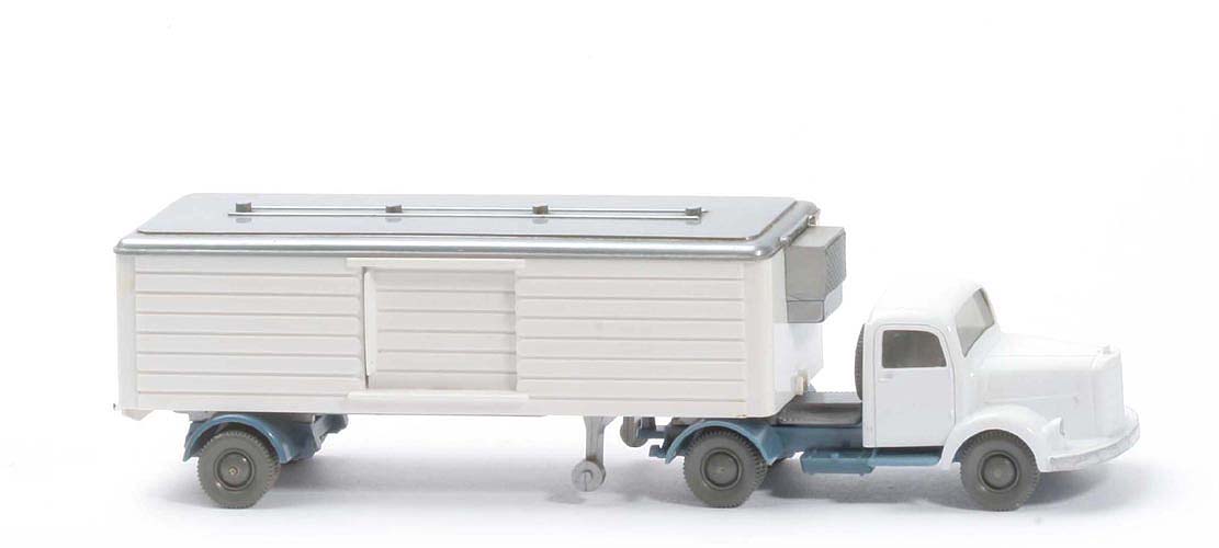| | Zugmaschine | | Farbe Kabine | weiß | | Farbe Chassis | mattgraublau | | Bemalung | Scheinwerfer, Stoßstange | | Sattelpfanne | alt, mit Steg, für kleinen KöBo | | Achshalterungen | offen | | Bodenprägung | WM (ohne Kreis) | | Reserverad | hinter Kabine | | Räder | neuere Ausführung | | | Auflieger | | Dach | silber | | Aufbau | weiß | | Bodenprägung Aufbau | Wiking Modell, MiG, 52, Viking Model | | Kühlaggregat | silber | | Radlauf | mattgraublau | | Achshalterungen | offen | | Chassis | silber | | Stützrollen | silber | | Königzapfen | dünn, mittig auf Platte | | Bodenprägung Chassis | WM hinter KöBo | | Räder | neuere Ausführung |