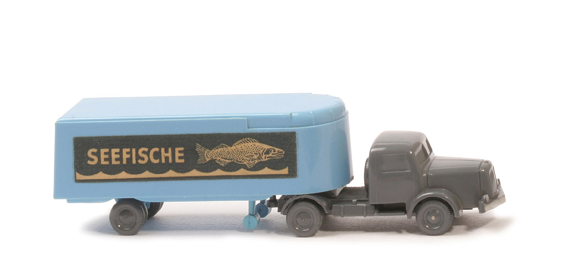 Achsen | Rollachser | | Zugmaschine | Farbe Kabine | basaltgrau | Farbe Chassis | basaltgrau | Bemalung | Scheinwerfer, Stoßstange | Sattelpfanne | eingesetzt, in Chassisfarbe | Chassis | Version 1a | Achshalterungen | geschlossen | Bodenprägung | WM (ohne Kreis) | Reserverad | hinter Kabine | Räder | mit Profil, basaltgrau | | Auflieger | Farbe Oberteil | lilablau | Farbe Unterteil | hellblau | Radlauf | ohne Kotflügel | Bodenprägung | WM im Kreis | Rückleuchten | ohne | Dach | glänzend | Aufkleberart | Papier, matt | Beschriftung | Seefische blau auf weiß (s. Foto) | Räder | mit Profil, basaltgrau |