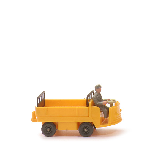 | Aufbau | gelb | | Fahrer | ca. platingrau | | Lenkrad | hellolivgrau, 3-speichig | | Bodenprägung | WM, Germany, 116 | | Zughaken | integriert | | Batteriekasten/Achshalterung | gelb | | Aufsatz mit Messingwänden | gelb | | Bemalung | ohne | | Räder | ca. 7 mm, anthrazit |