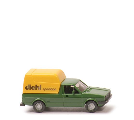 | Farbe | dunkelmaigrün | | Außenspiegel | beidseits | | Verglasung | klar | | Dreieckfenster | mit | | Inneneinrichtung | ca. anthrazit | | Lenkrad | integriert | | Chassisfarbe | anthrazit | | Bodenprägung | Wiking VW Caddy Berlin-W Germany | | Stoßstangen | umgreifend | | Grill | 4 waagerechte Leisten (gerillt) | | Kasten | gelb | | Verglasung Kasten | klar | | Bemalung vorne | Scheinwerfer silbern | | Bemalung hinten | ohne | | Beschriftung Kasten | diehl spedition | | Beschriftung Art | Druck blau | | Räder | anthrazit, Riffelkappe gesilbert |
